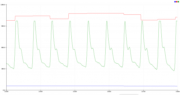 The Pulse Sensor works using photoplethysmography. The analogue heart pulse signal in green comes in Voltage over time and reacts on light intensity changes of the Light Emitting Diode (LED) [239]. The Pulse Sensor is directly connected to the Microcontroller working on 3.3 Volt. The Analog data of the sensor are processed by the software and finally plotted as you can see in Figure 80. The software works with 20 Hz so 20 values per second are analyzed using an Interrupt Service Routine (ISR). We are using an 8-bit onboard timer to measure the time between each beat sampling with 500 Hz. Doing that the amplitude of the heartbeat has to go over 512 at first, which is the middle of the analogue range and changes during the run to 50 % of the average last ten wave amplitudes. When the waveform rises past the thresh value, and 3/5 of the last Interbeatintervall (IBI) has passed, a pulse had occurred. In an array, the last ten IBI Values are saved. The BPM is derived every beat from an average of the previous 10 IBI times. If the signal is over a threshold, the Q-S (Quantified Self) Bool is set to true to count a heartbeat and so that the rest of the program knows a beat is found. Timer filters are included to avoid high-frequency noise. For example to avoid dichroic noise by waiting for 3/5 of last IBI. The time between each heartbeat is measured by the IBI and processed with the red line. BPM are calculated in the software and are plotted with the blue line. The green line images the pulse signal itself.