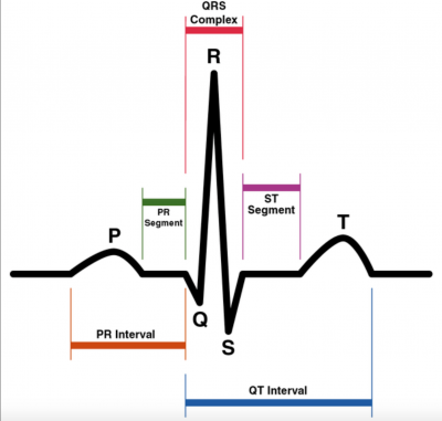 The Electrocardiography (ECG) is a graph with voltage over time measuring the electrical activity of the heart. The cardiac muscle re- and de-polarization during a cardiac cycle is detected. As you can see in Figure 79 the heartbeat is divided into specific phases. During each heartbeat, a healthy heart has an orderly progression of depolarization that starts with pacemaker cells in the sinoatrial node, spreads throughout the atrium, passes through the atrioventricular node down into the bundle of His and into the Purkinje fibres spreading down and to the left throughout the ventricles [237].