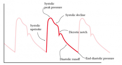 The difference is that Figure 79 shows the voltage signal of the heart. What we measure is the response to this. We are measuring the arterial pulse waveform using photoreflectance containing a photocell sensor as our pulse sensor. The wave you can see in Figure 80 is a shockwave which means it travels much faster than the actual blood. It represents the impulse of ventricular contraction. The wave can be separated into an anacrotic upstroke limb and a dicrotic downstroke limb [240]. Figure 81 shows the dependence.