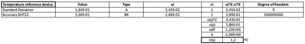 For the temperature and humidity measurements, the mean values were calculated. It is separated between two Types of uncertainties. Type A estimates based on the statistical evaluation of a series of repeated measurements. Type B is estimated by methods other than type A. For example, Calibration Certificates or results of previous measurements. For the standard uncertainty Type A is chosen. This is the best available estimation or expected value of a quantity that varies randomly with not so many measurements. It is more accurate for a small number of measurements. It is important not to consider each source of uncertainty more than once. So, if a source was included in type A determinations, it should not be considered for type B uncertainties. For the accuracy of the measurement instrument Type B is chosen. To mathematically express the uncertainty according to the input quantities it is important to understand that Y depends on a number of input quantities Xi (i = 1, 2, …, N) according to the functional relationship. the definition of the proper measurement calculation is obtained from measured values (input quantities), which is mathematically represented by a function that relates the dependent variable (Y) to the independent variables (X1, X2, … XN ). This approach is what is used in most uncertainty studies and can be termed as an analytic model approach. To Calculate the standard uncertainty of each component the experimental average standard uncertainty (Type A) is chosen. This is an average qualifier.