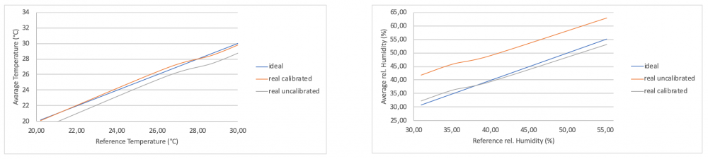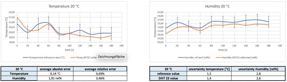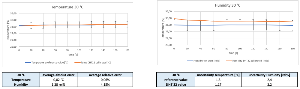 For the Temperature and Humidity tests, we went to the Instituto de Investigação e Inovação da Universidade do Porto (I3S). There the possibilities for proper temperature and humidity tests were given. In an Incubator “IKA KS 4000 ic control” the temperature and humidity were set on a constant level. With two temperature and humidity reference devices “Omega HH314A” the values were compared with the “DHT22” measurements. Every minute the values were read until ten values for one set is recorded. Afterwards, absolute and relative errors were calculated, and the accuracy of the devices was considered to calculate the uncertainty. This was realized for 30 °C, 28 °C, 26 °C and 20 °C.