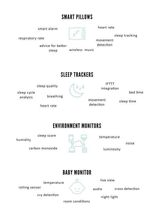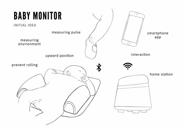 The main initial objective of the smart pillow was the stress relief for the parents after birth. For this target, the team designed the prototype which monitors the baby's health and the environment. Furthermore, cry detection and reaction were included. The health is measured by the pulse sensor which is included in a sock. During the period of the 24 months, the infant is growing. Thus, the size of the sock is adjustable. The prototype was printed with the 3D printer and the textile is sewed over it by hand. In cases of cleaning the sensor can be put out of it. To low the risk of SIDS the team designed a pillow with two side bumpers. Thereby the infant is prevented from lying on its tummy. Like the sock, the size of the pillow can be adjusted too. Moreover, cry detection is realized by the microphone which can measure noise changes next to the baby. An MP3 player plays music through a speaker to calm down the crying of the baby. Both components are positioned in the pillow and can be removed from the pillow when the cover of the pillow has to be cleaned. The environment of the baby and the parents are realized in the Home Station. It can measure the room temperature, relative humidity and carbon dioxide in the room. The station itself is printed with the 3D printer. All the components are positioned without warming influences of the other electronic parts. The measured values are monitored on the open-source IoT platform ThingsBoard. In a dashboard, the history of every measurement and the alarm is shown visually and intuitive for the customer. The design for an application is also done.