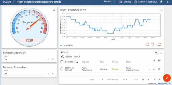 Figure 96 shows the detail page for the example of the room temperature. On the top, the current room temperature is shown in the form of an analogue gauge. Furthermore, the room temperature history is shown in a temperature-real-time diagram. The real-time axis can be edited manually on the right top of the dashboard. In Figure 96 the axis is set to one hour. For this period the minimum, maximum and average temperature are documented in the right bottom of the diagram. On the button of the page is an alarm window. It shows all the notifications of the sensor. Moreover, the minimum and maximum temperature range can be edited on the left-hand site. When the room temperature is out of the given range, the alarm gives a notification. This reaction is realized by the Rule Engine which is part of ThingsBoard. For testing the notification a high room temperature is created. As seen in Figure 96, the alarm gives the notification. The test proves the functionality of the edited temperature range in combination with the alarm. Furthermore, the privacy settings for the dashboard can be set. In this way, only the parents can see the status of their child.