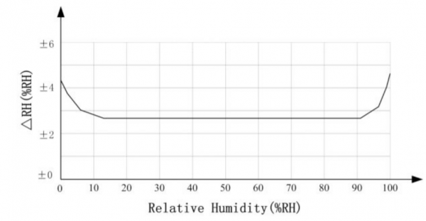 The following two graphs represent the error of RH (at 25°C) and the maximum temperature error.