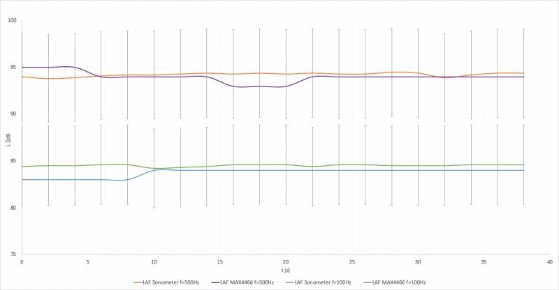A baby cry has a frequency range from 336.9 Hz to 502 Hz [248]. Due to that, the frequency stability of the MAX4466 is tested. In Figure 91 the noise level in dBA overtime for the two extreme frequencies can be seen. The reference graph is laid over the ones of the microphone. The lower the frequency gets the bigger is the deviation between these graphs. Due to the fact that our target is to create a cry detection and not an exact sonometer the deviations can be accepted. Because of that, we accept a deviation of ± 5 %. Within that range, a cry is still reliably detected. As an example, both extreme values are shown with the acceptance range in Figure 91. It can be seen that the measured extreme values for frequencies of 100 Hz and 500 Hz compared with the sound level meter with the acceptance range of 5 %.
