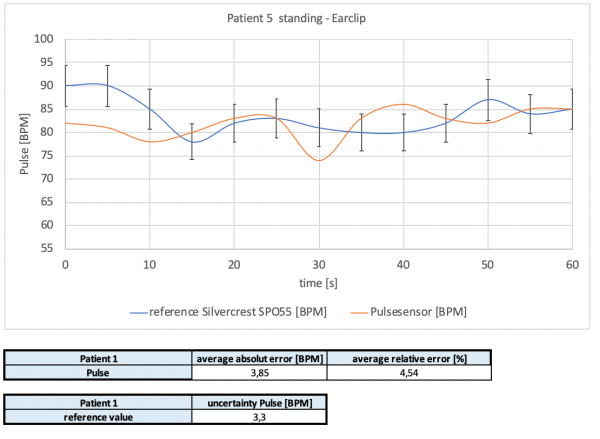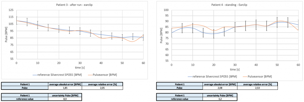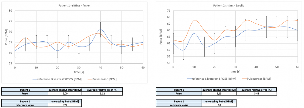 In the following the graph of the reference medical device Silvercrest SPO55 with an accuracy of ± 2 BPM in the range of 30 BPM to 250 BPM Pulse. The error and uncertainty calculations are done the same as explained in the temperature and humidity measurement chapter before.