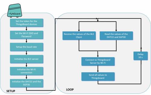 The installation of the BLE client is followed by the installation of the BLE server on the microcontroller of the Home Station. Figure 94 shows the flowchart of the Arduino code. It starts with the setup. First, the unique tokens for each device for the ThingsBoard connection and the WiFi is fixed. Additionally, the baud rate is set for the feedback of the microcontroller. After this step, the BLE server, the WiFi and the sensors are started. On the right side, the coding of the loop circuit is shown. It reads the values of the home station sensors, receives the values of the BLE client. Both steps are done separately. In this way, the Home Station can only send the environment values without measuring the baby status. Afterwards, the Home Station connects to the Thingsboard server by Wifi and sends all sensor values to Thingsboard divided by the different tokens of the devices. After this step, the loop starts again after ten seconds.